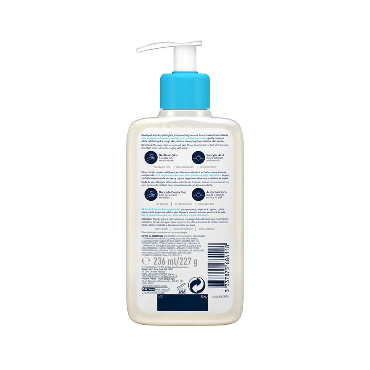 CeraVe SA Smoothing Cleanser provides gentle, non-irritating exfoliation without harsh microbeads that can scratch your skin. Suitable for use on your face and body as well as acne-prone skin, our salicylic acid cleanser not only exfoliates the skin, but with three essential ceramides, hyaluronic acid and niacinamide, it also helps soften and smooth the skin without disrupting its protective barrier. This formula is also non-comedogenic, fragrance-free and enriched with antioxidant vitamin D.